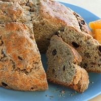 2: In a medium-size bowl combine flour, sugar, baking powder, salt and baking soda. Stir in raisins and caraway seeds.