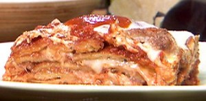 3. Place 1 layer of fried eggplant into a casserole dish (square 8×8 is good for this recipe), cover with sauce, sprinkle with Parmesan cheese and place a layer of mozzarella cheese on top of that. Repeat procedure until all eggplant is used, ending with mozzarella cheese.