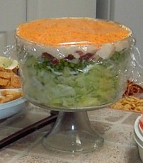 This is a recipe that I am sure most people have had at least once at a party. Some call it seven layer salad also. I have added a few ingredients of my own so it comes out a little more than seven layers! The picture I have here is when I made it for my friend Dana’s baby shower back in 2004! I usually put this salad in a trifle dish but if you don’t have one you can use a large clear glass (9×12) baking dish. There are usually no leftovers either. If you want to cut some calories use light mayonnaise, 2% cheddar, turkey bacon, and a sugar substitute such as Splenda for the sugar.