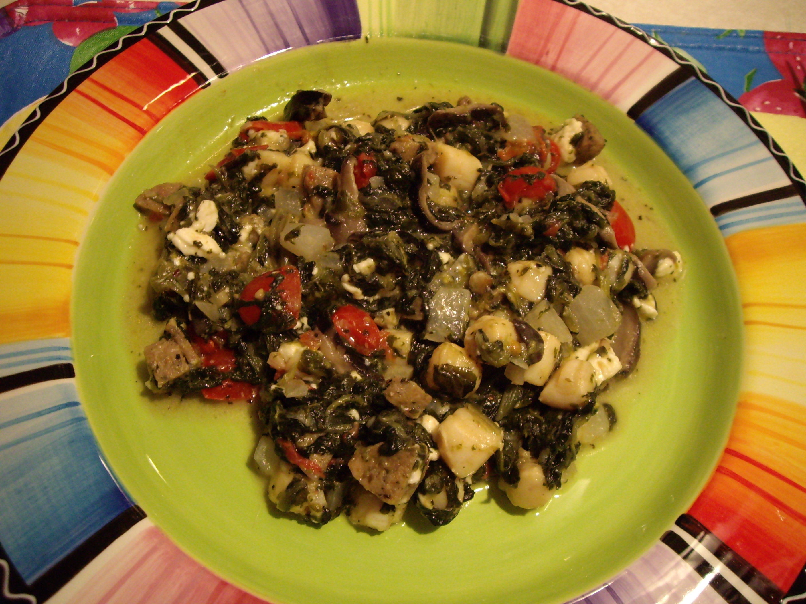 3. Add the chopped sausage to pan, cook for about 5 minutes. Add the spinach and stir well, cook another 5 minutes.
