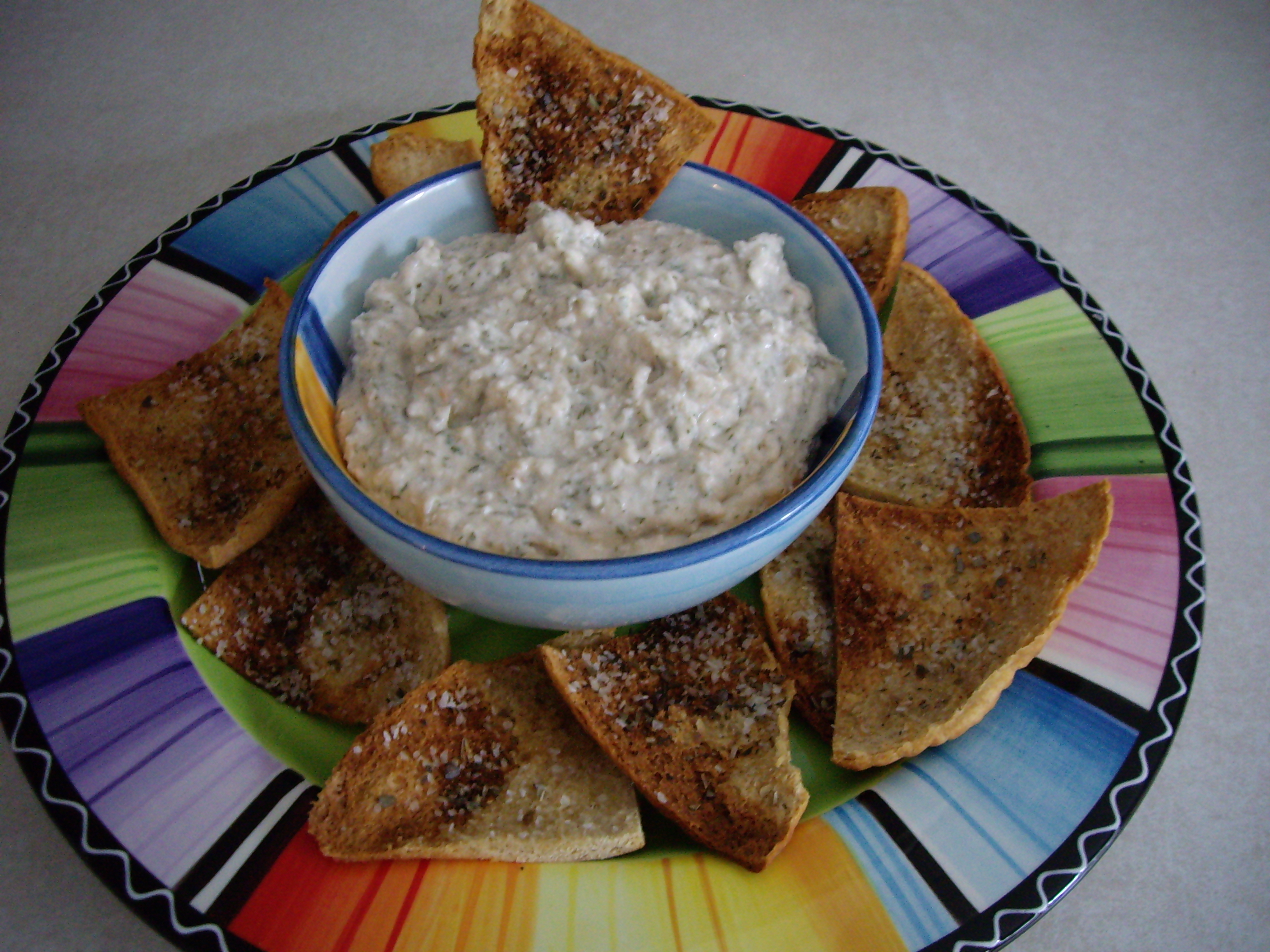 This dip is a little bit Greek and Italian, hence the Mediterranean reference. It’s a much healthier dip than the ones laden with mayonnaise and sour cream. Not that those dips aren’t good, it’s just that we can’t eat them all the time. This dip uses canellini beans which have fiber, a good thing. It can be served with toasted pita chips or crostini, or any sturdy chip. I will also include a recipe to make your own Toasted Pita Chips. It’s so easy! And if you use the low carb pita chips you can save more calories and add more fiber! But if you don’t have to worry about calories or fiber go all the way with the full fat stuff! (I wish I could!)