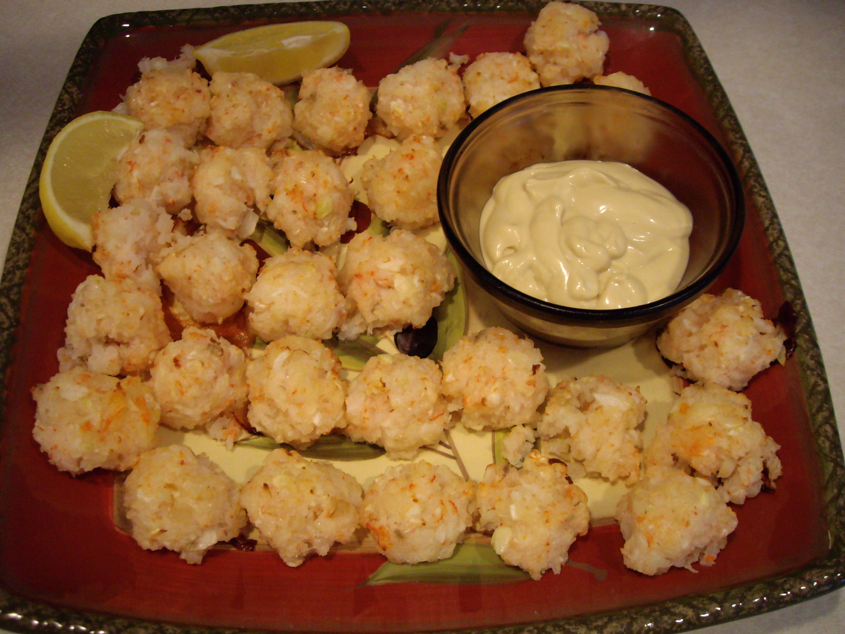 2. Shape mixture into small balls (about 1 teaspoon). Place on a lightly greased cookie sheet. Spray balls with olive oil and bake at 350º for 20 minutes. Serve hot with lemon wedges.