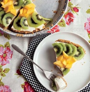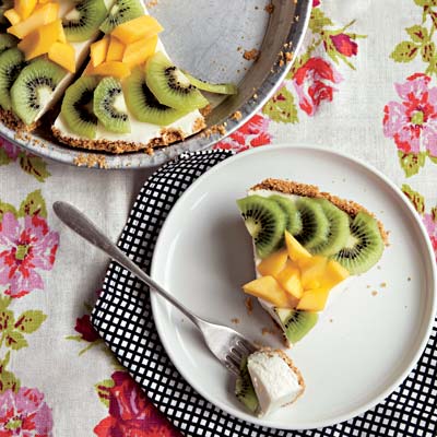 5. Add the condensed milk, cream of coconut and melted gelatin and beat at medium speed until smooth. Fold in the whipped cream. Transfer the pie filling to the chilled crust. Refrigerate, uncovered, for 3 hours. Top with the mango and kiwis.