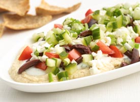 1. Spread the hummus onto bottom of a 9″ pie plate or other serving dish.