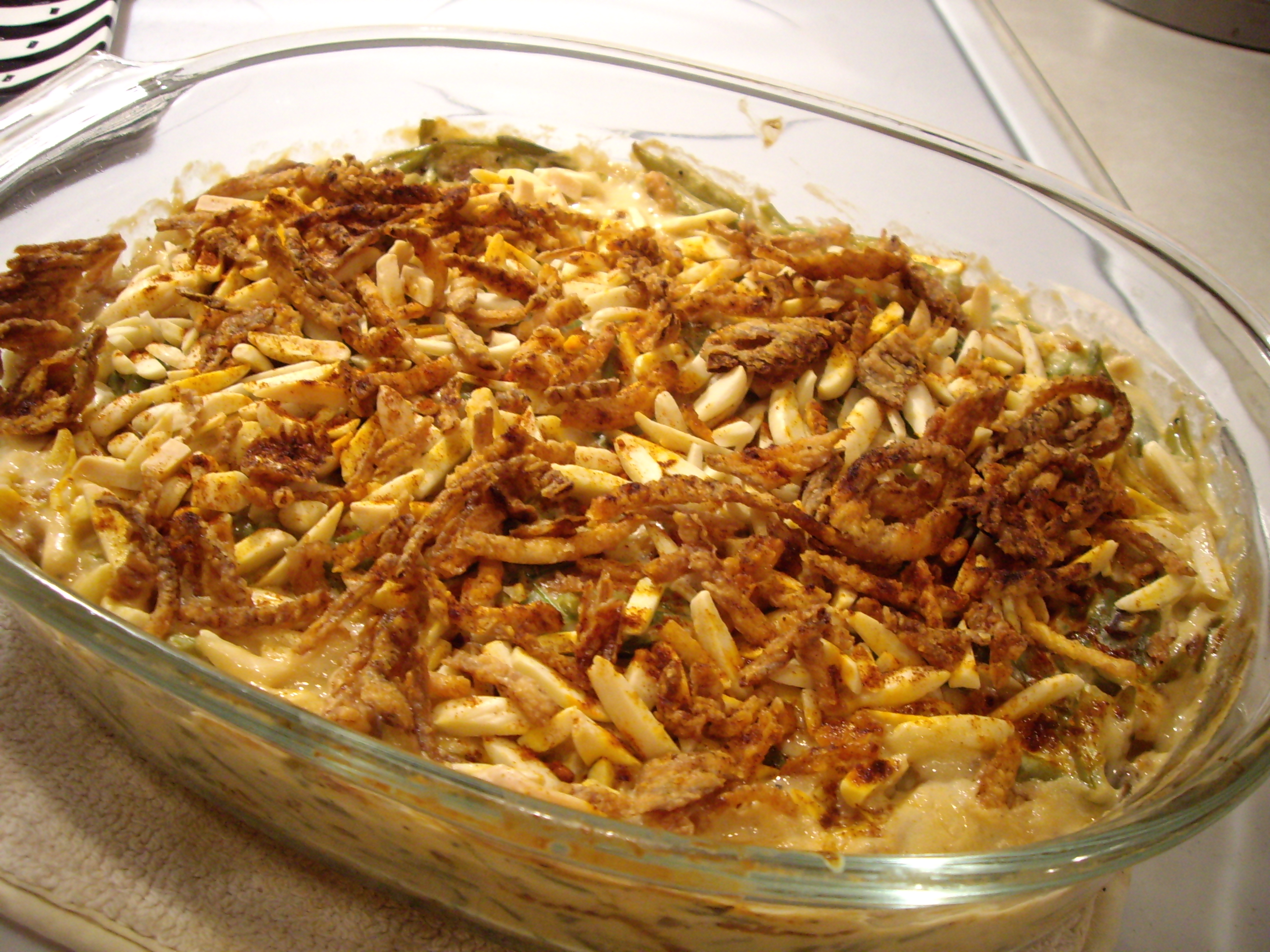 4. Spoon the mixture into a lightly greased 1¾ quart casserole dish. Top with the almonds and remaining french-fried onions. Sprinkle with paprika.