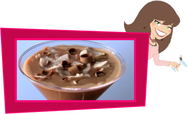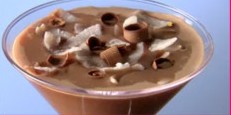 4. Pour into chilled martini glasses. Top with coconut and chocolate shavings.