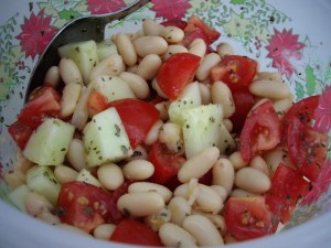 Finding dishes that I can put together quickly is becoming more of a habit these days. Between work and chores around the house I am always looking for fast, healthy dishes. For the past holiday weekend I didn’t have a ‘salad’ to serve with our meal. I was tired of the same old lettuce salads. So I looked in my refrigerator. I found a cucumber that had about a third left on it. I also had a few Campari tomatoes that were very ripe and wouldn’t last much longer. So I chopped them up and mixed with some garlic. Then I thought it needed something else because it really wasn’t enough for 4-6 people who would be dining with us. So I threw in a can of white cannellini beans. Yum! I also added some white balsamic vinegar and olive oil and mixed it up. Delicious and it was a huge hit! Fast and good for us!