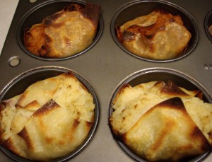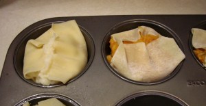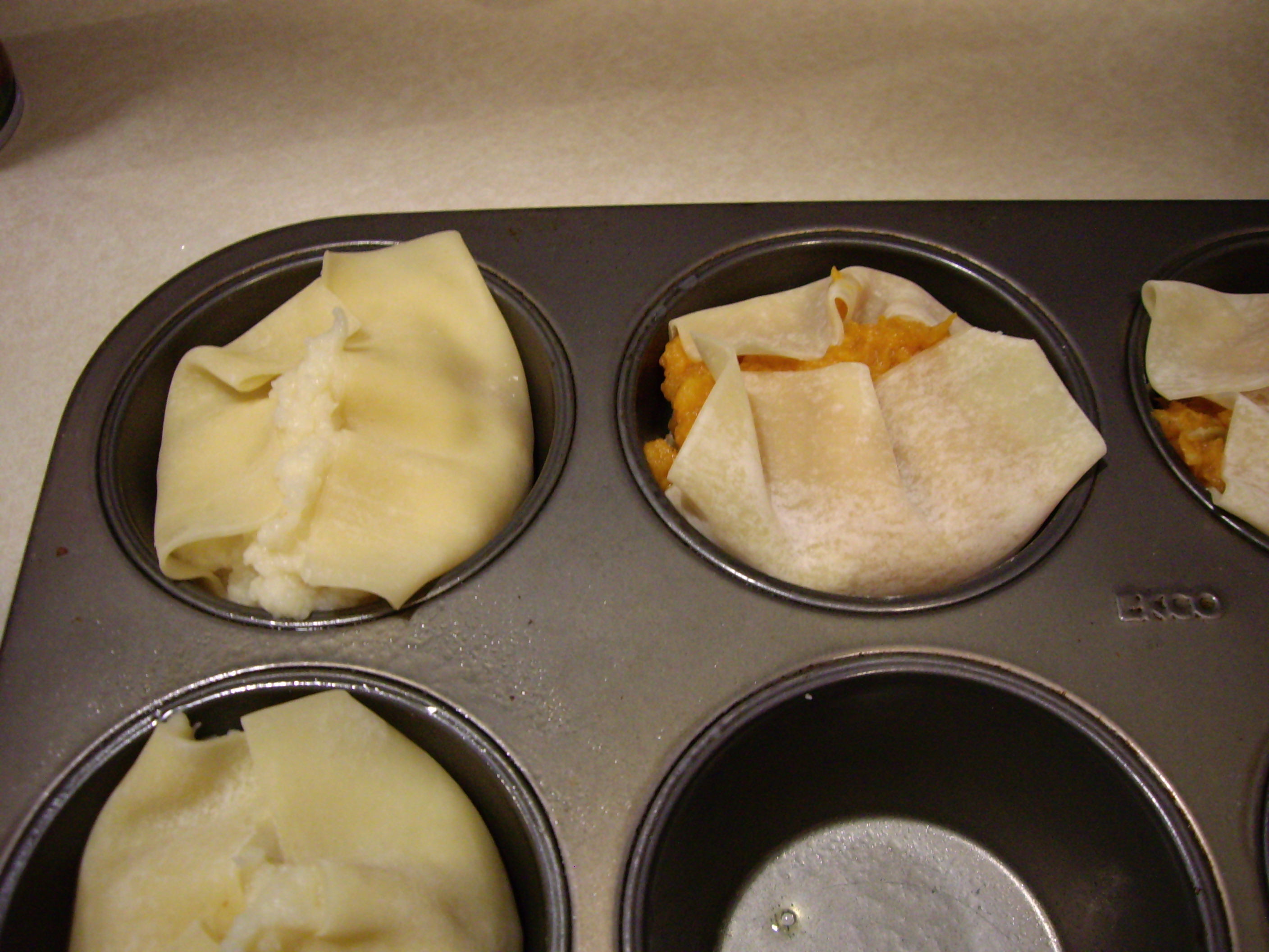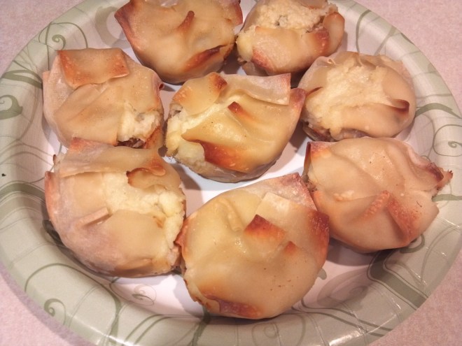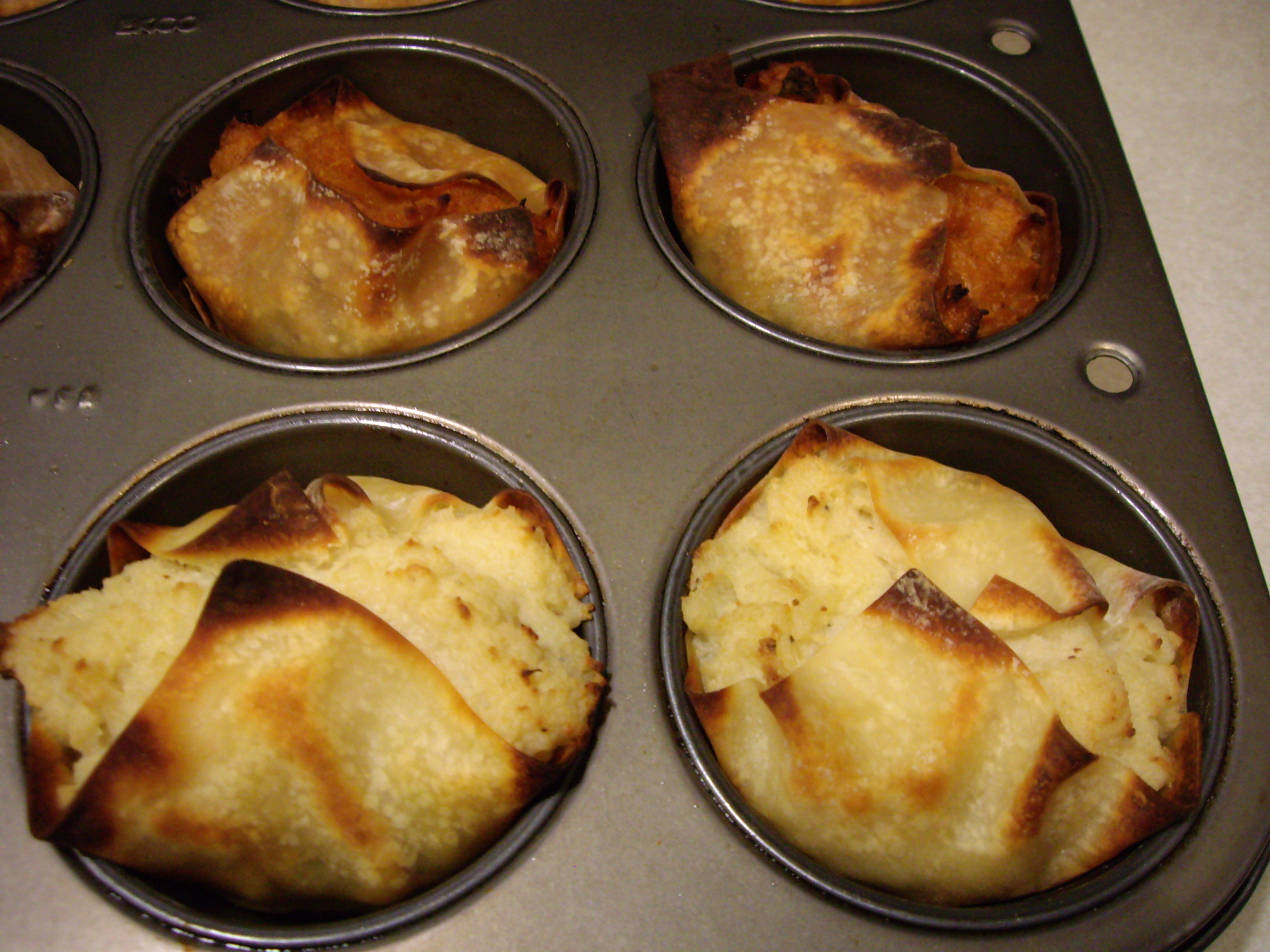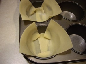 In a regular muffin tin, lay two small wonton wrappers so half is in the tin and half hanging over the edge.