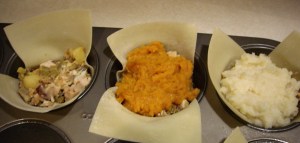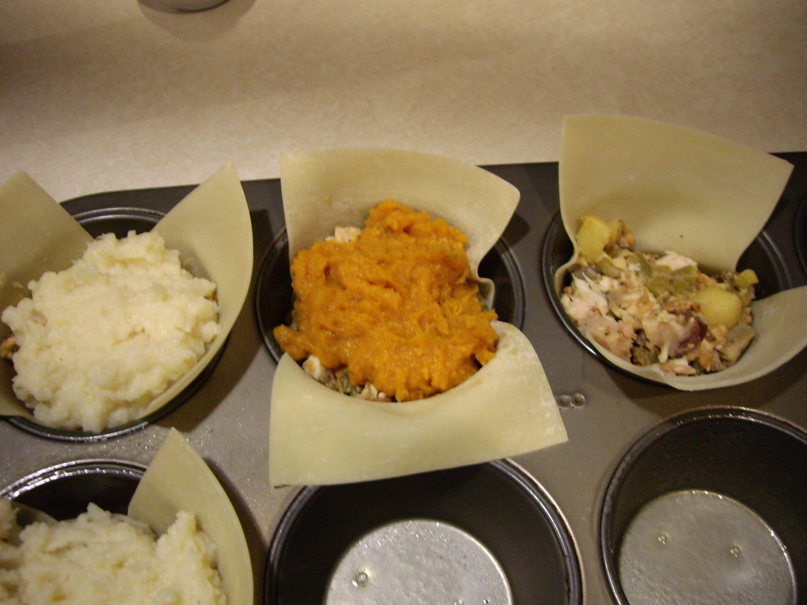 Fill the tin with the turkey mixture about 3/4 way full. Press down. Then on top of that place either mashed potatoes or mashed sweet potatoes.
