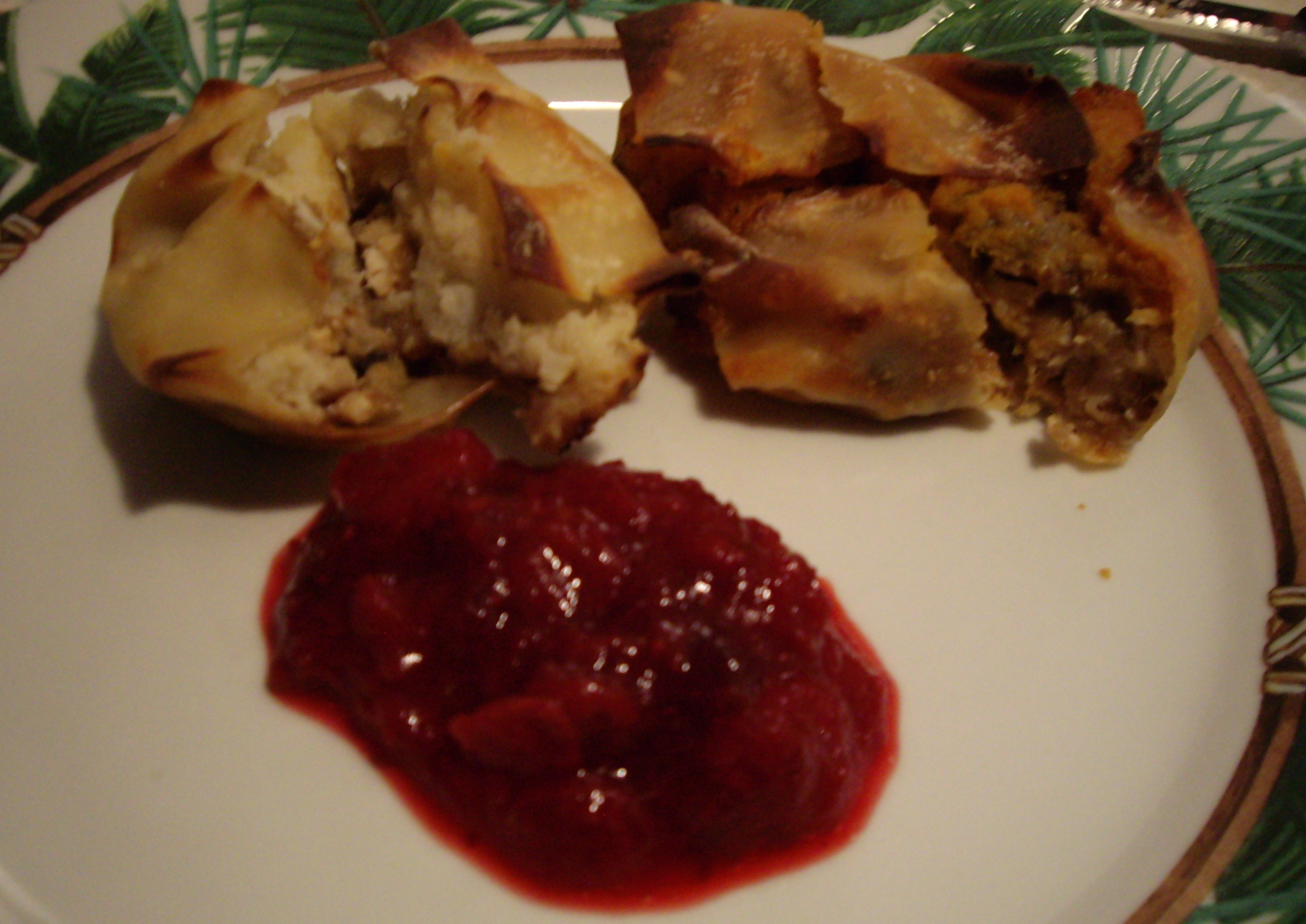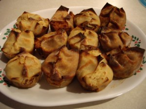 I actually always buy a turkey this time of year, you can’t beat the sale price (.59 lb)! I keep it in the freezer till July and then we have a summer Thanksgiving. And this recipe came about from my summer Thanksgiving. I am going to call it Thanksgiving Bundles. It is a cross between a pot pie, a mini calzone or some kind of pierogi. Not sure exactly how to describe it. But those of you who follow my blog know I have become obsessed with the wonton wrappers. Soooo I came up with a stuffed wonton ala Thanksgiving. Though for this recipe I am not using the mini muffin tin. Too small. I used the regular muffin tin but then realized one of the mini wrappers was way too small so I used two wrappers per muffin cup. I just had them half in half out, with enough of the wrapper sticking over the sides so you can fold them over the top when you’re done stuffing! Came out incredible!