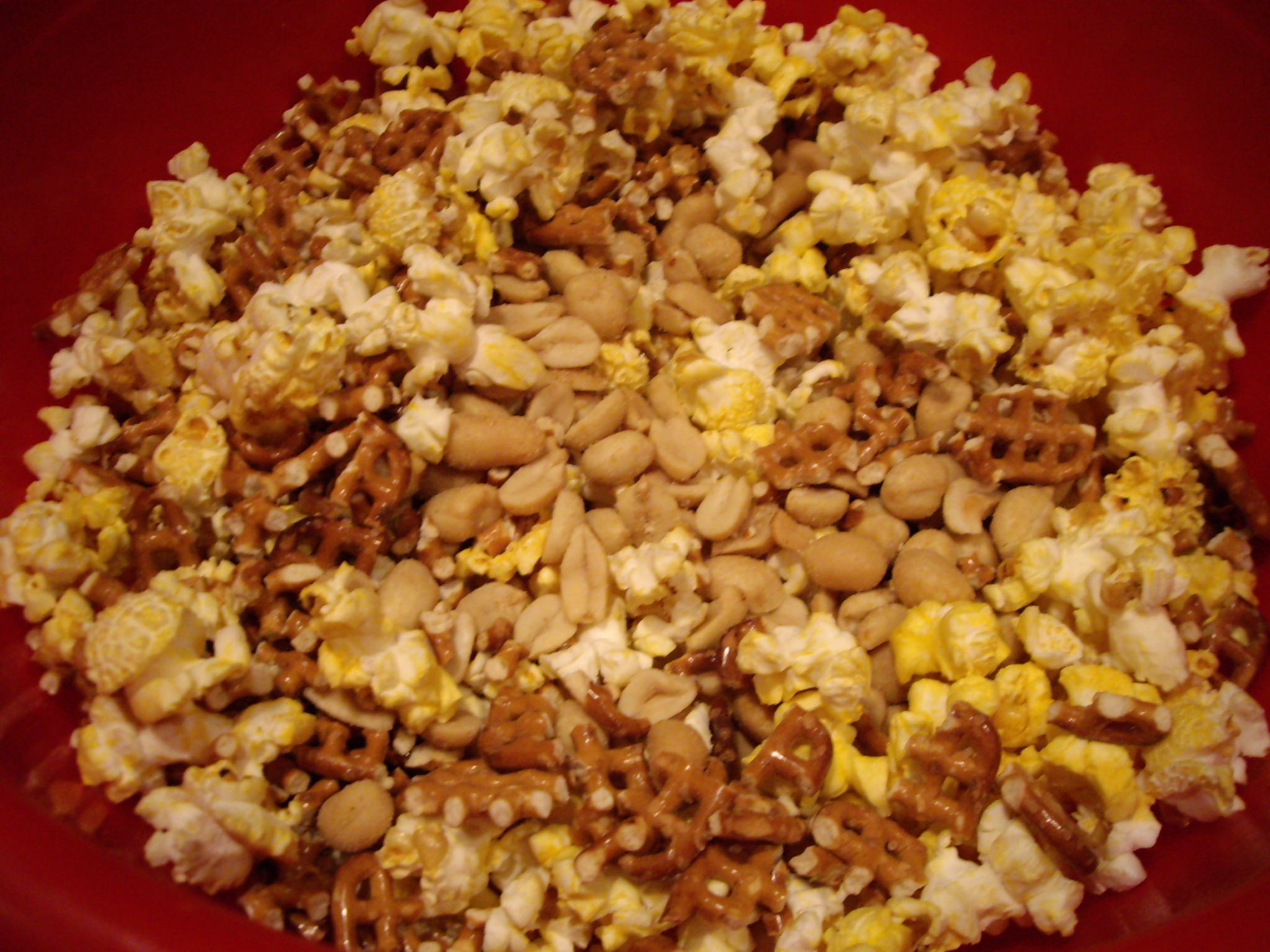1. Spray a large bowl with cooking spray. Add the popcorn, peanuts, and pretzels.