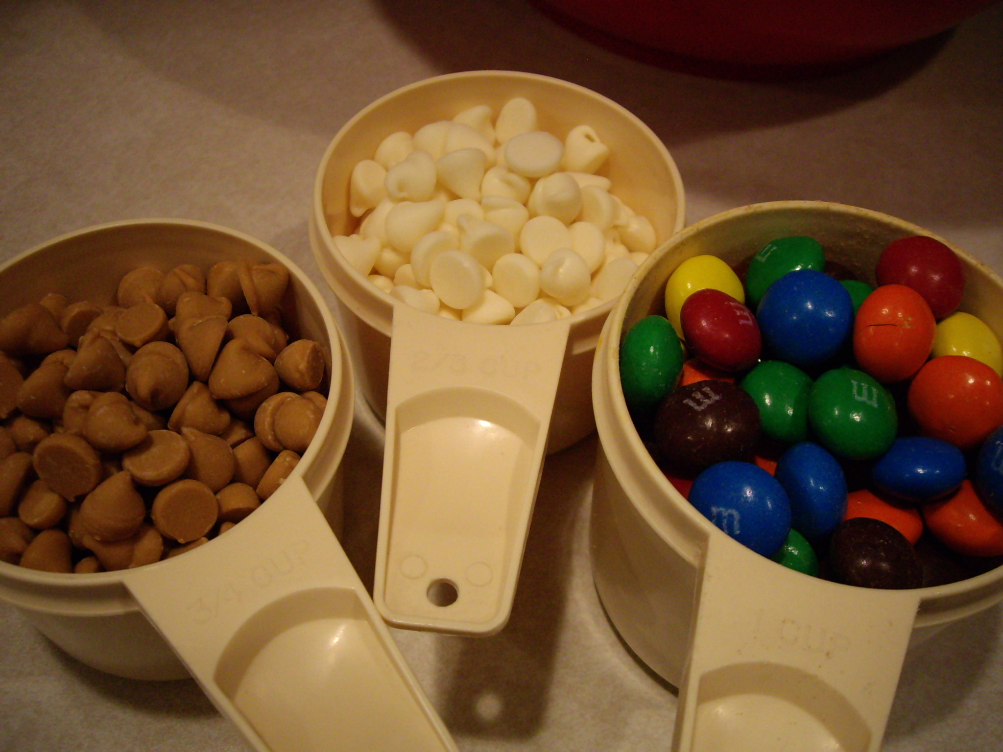 1 cup candy-coated chocolate pieces (like M&Ms)