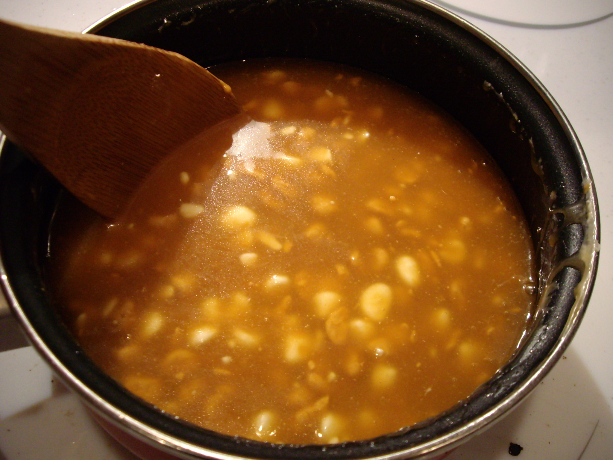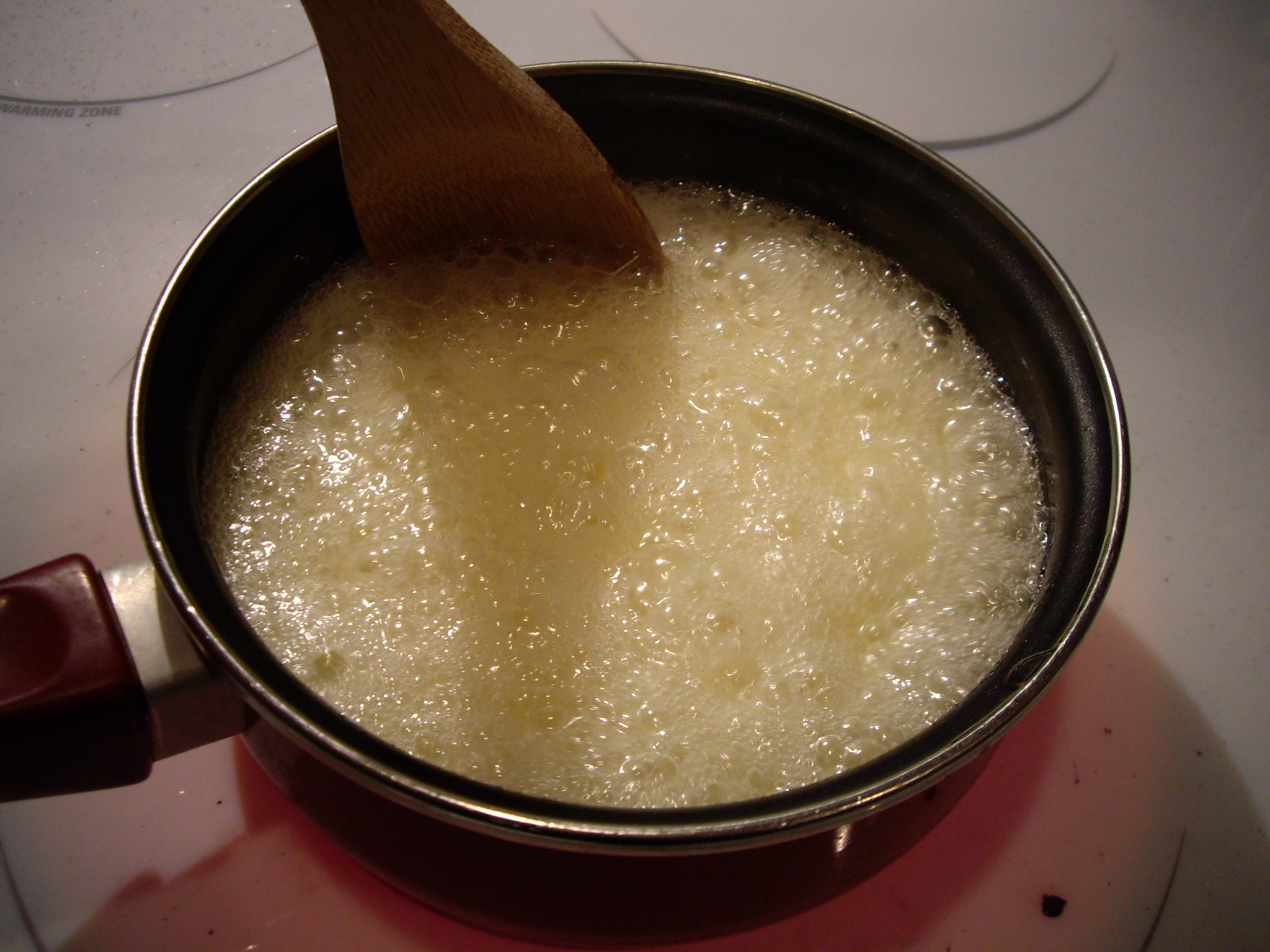2. Cook the corn syrup and butter in a medium saucepan over medium heat. Stirring constantly, bring to a full boil for 1 minute.