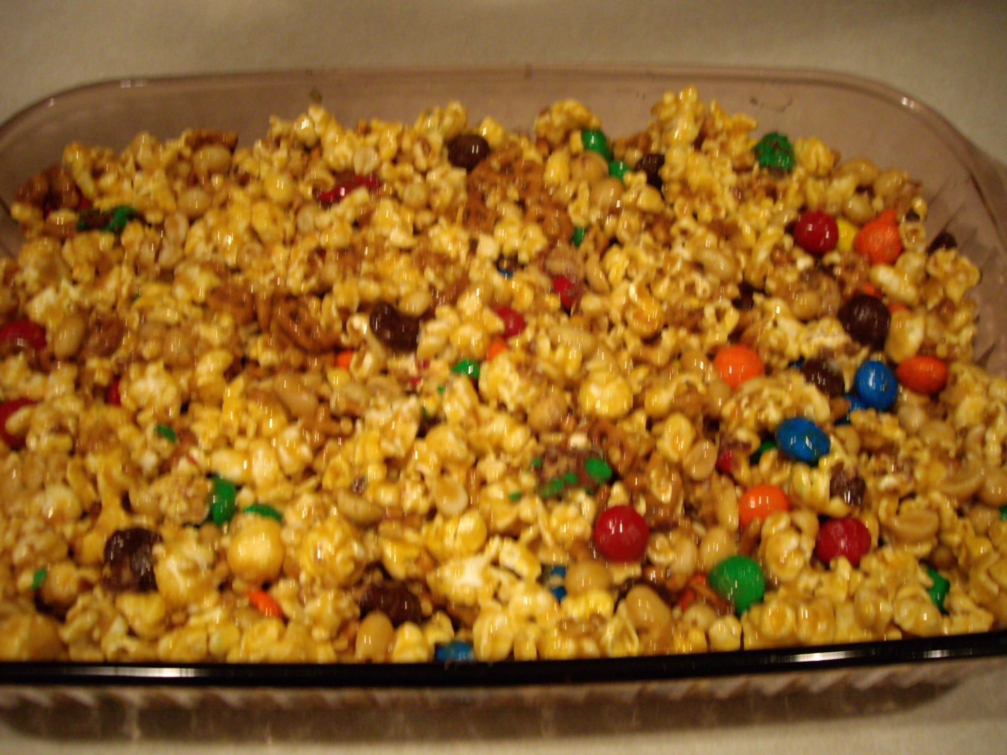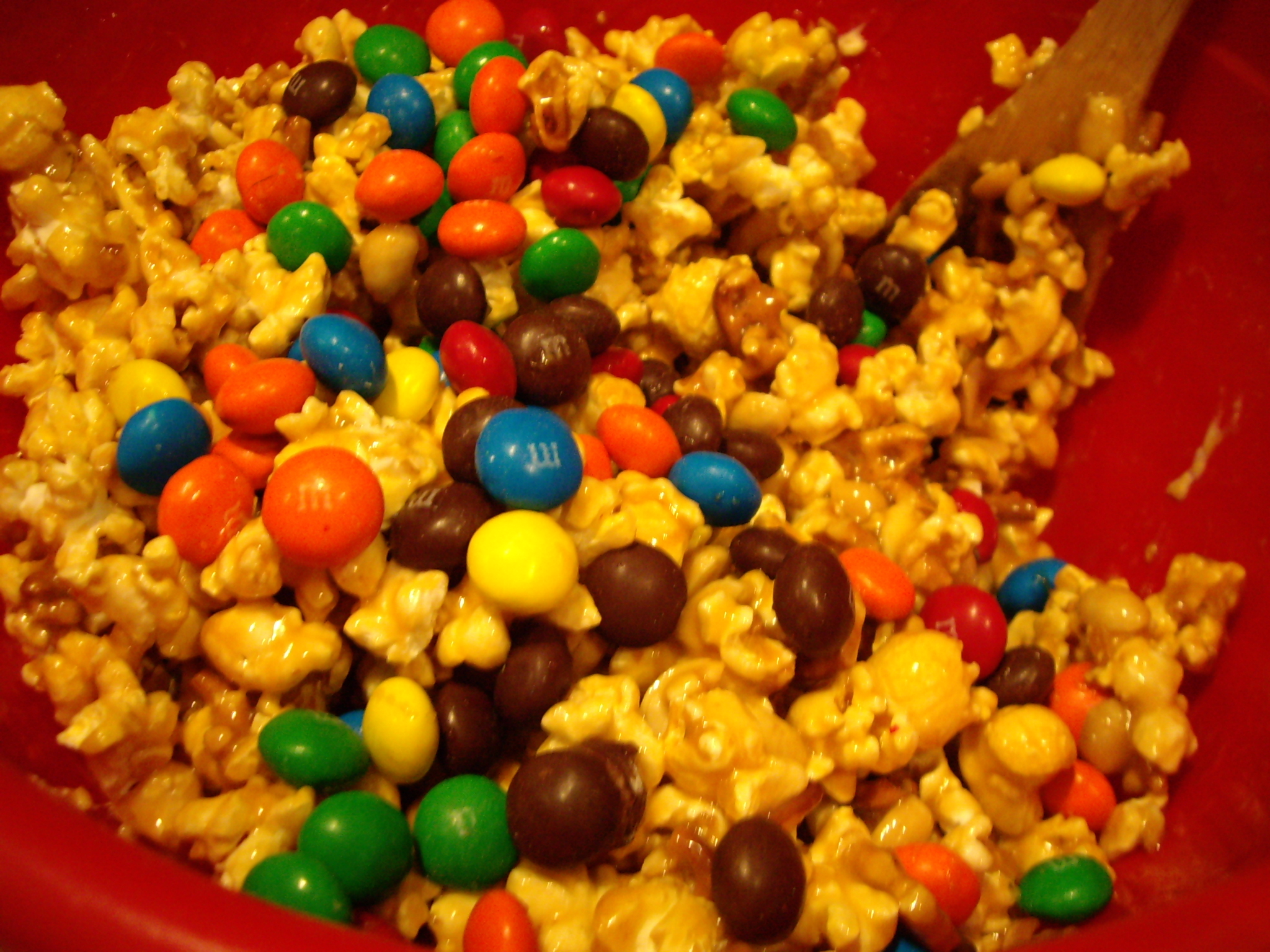 3. Remove from the heat and add butterscotch chips, stirring until melted. Pour over popcorn mixture and mix well. Stir in candy-coated chocolate pieces.