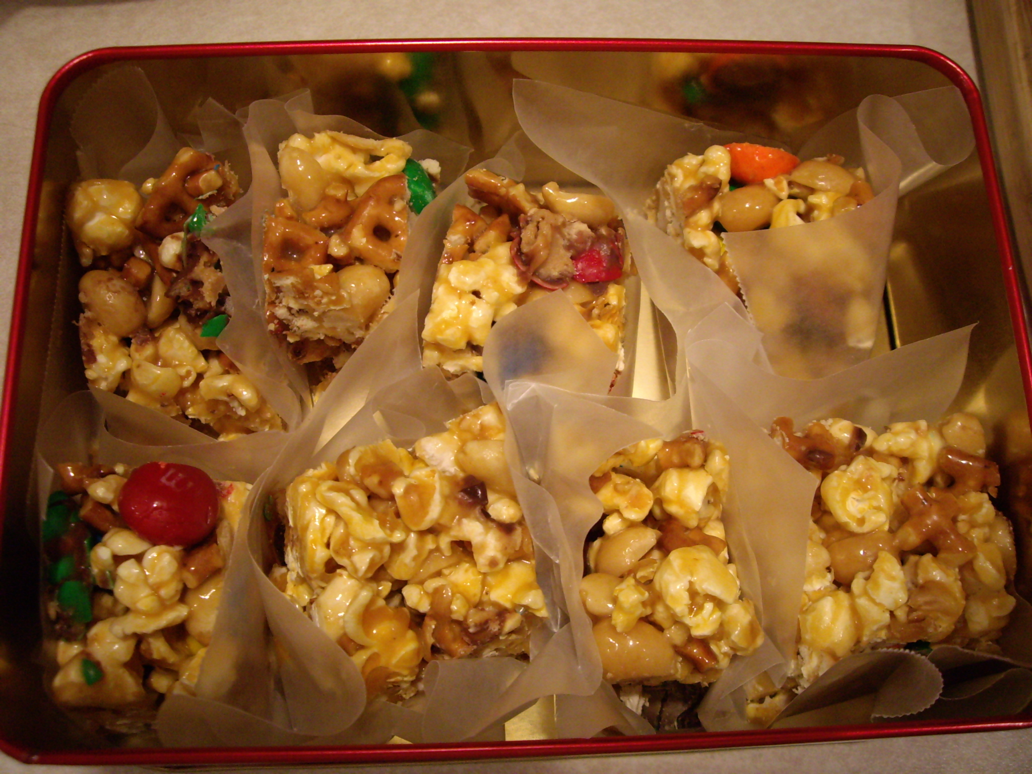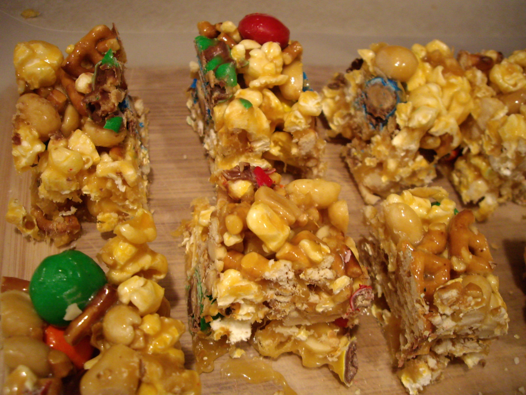Popcorn, popcorn, popcorn! I LOVE popcorn. If there was a popcorn diet I’d be on it for sure. The smell of freshly popped buttery goodness has to be the best smell in the world. I can’t walk past a movie theater without taking a huge deep inhaling breath! Aaahhh….The only type of popcorn I don’t usually like is popcorn balls. I don’t know why but for some reason they just don’t appeal to me at all. But these popcorn bars are something entirely different. They have salty peanuts, pretzels chocolate chips and candy! What’s not to like!  The candy-coated pieces can be in red and green for Christmas! Kids large and small will love them! I know I do!