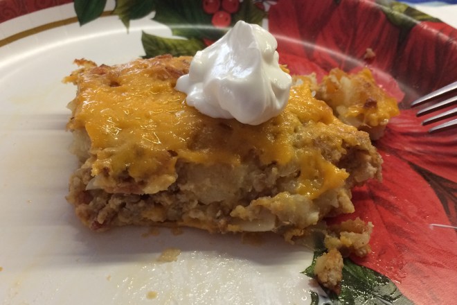 I’ve made this recipe twice now and I tweaked it even more from the original recipe from Kraft. Made it better! And sorry, it’s not low-calorie, but come on, its got tater-tots in it! Or as they are sometimes called potato tots, potato puffs, etc. I have used Great Value brand and Aldi’s brand. Both came out amazing! The pictures are from the first time I made it since I forgot to take pics the second time. It was Super Bowl Monday the 2nd time and it sure hit the spot that morning!