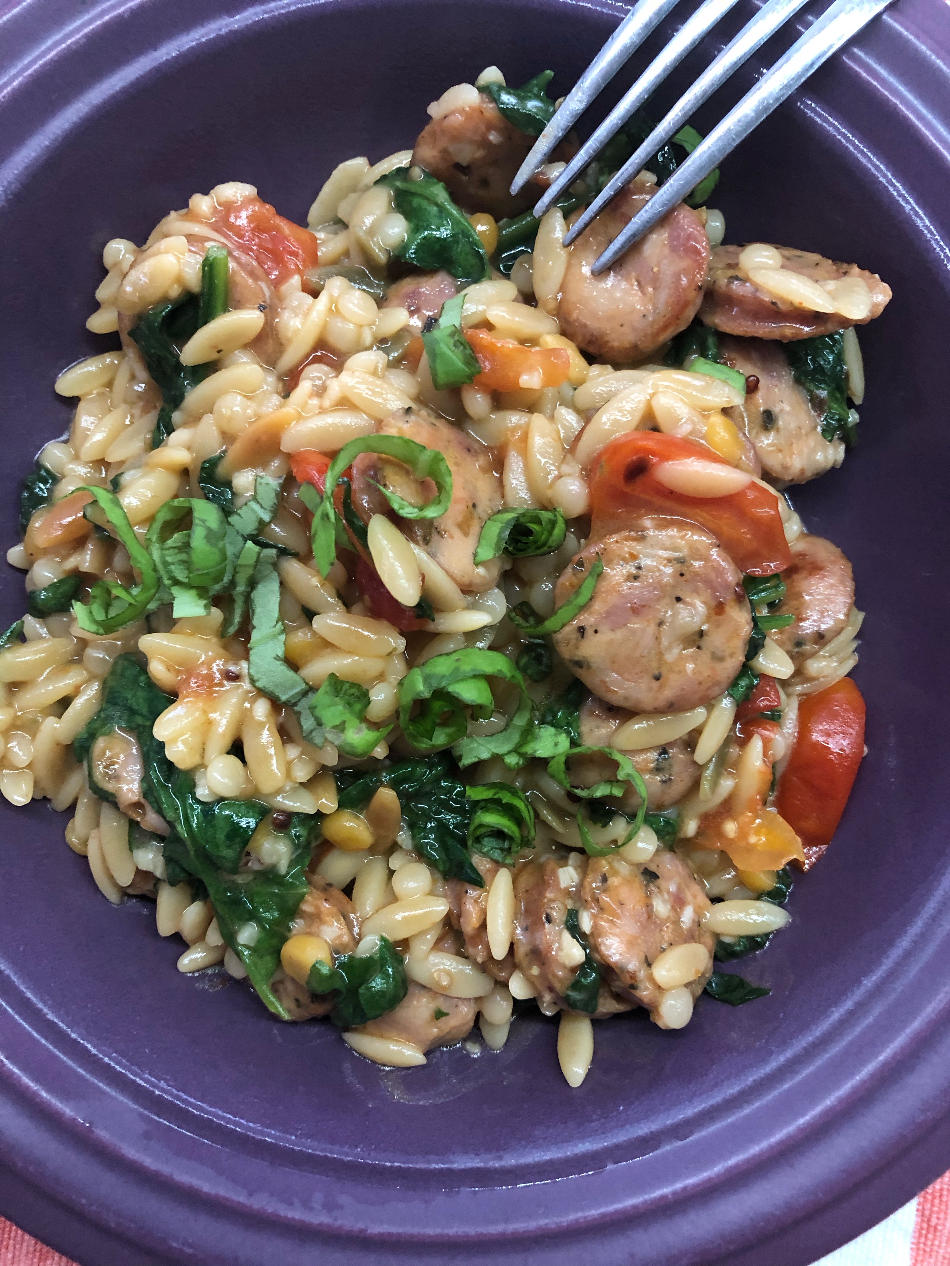 So the slacker blogger is back. I thought I would have posted long before now but being a slacker I didn’t. But the dish I made for dinner last night prompted me to get my butt in gear and post something! I had found this recipe about a month or so ago and kept saying I’d make it. Finally made it! I had to change a couple things from the original recipe 5 Ingredient Chicken Sausage and Orzo Skillet.