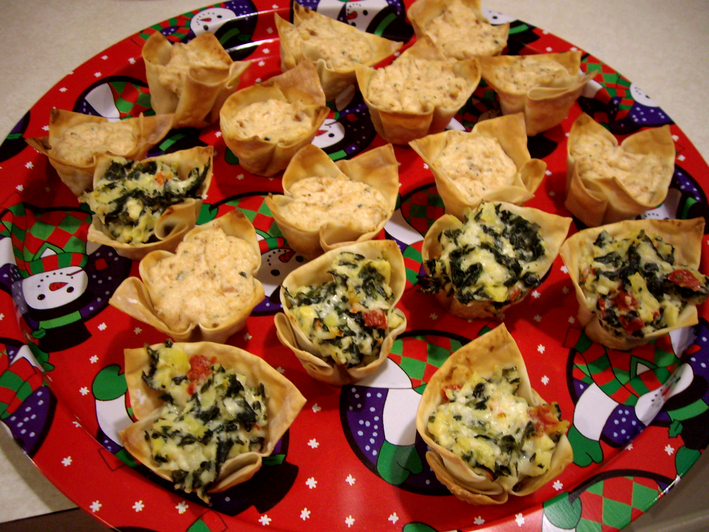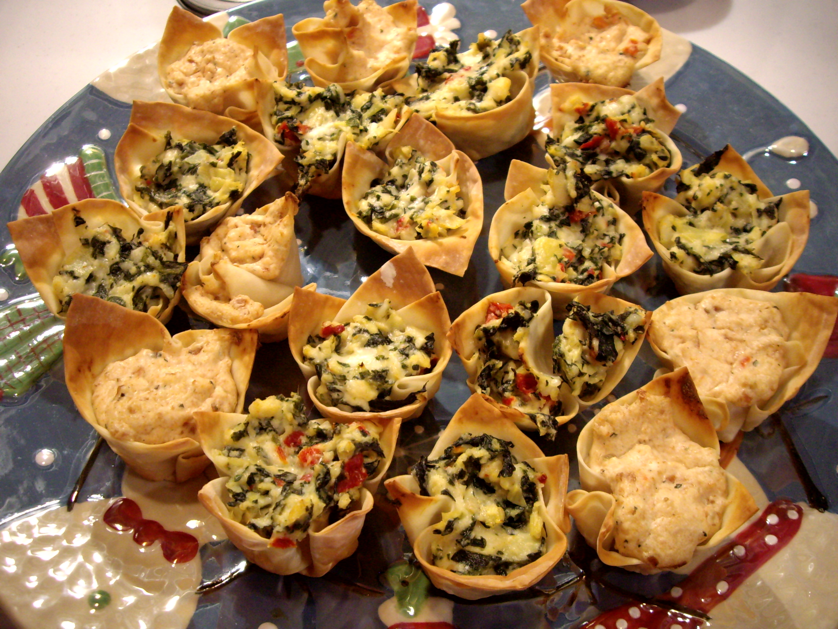 Well this past week I decided to finally venture into the won ton appetizer realm. I have to say it was a huge success! These little wrappers are so cute! I made two different ones and the were both a huge hit. The main recipe I used was spinach and artichoke. I got the recipe originally from Kraft Foods and tweaked it. It called for red peppers. Everyone knows I don’t like sweet peppers so I used sun-dried tomato as well. If you want the original “Warm Spinach & Artichoke Cups” click and check it out. The second one I made was a sausage/cream cheese combo. I had two large Italian style chicken sausages and just ground them up and added cream cheese. HUGE HUGE HIT!