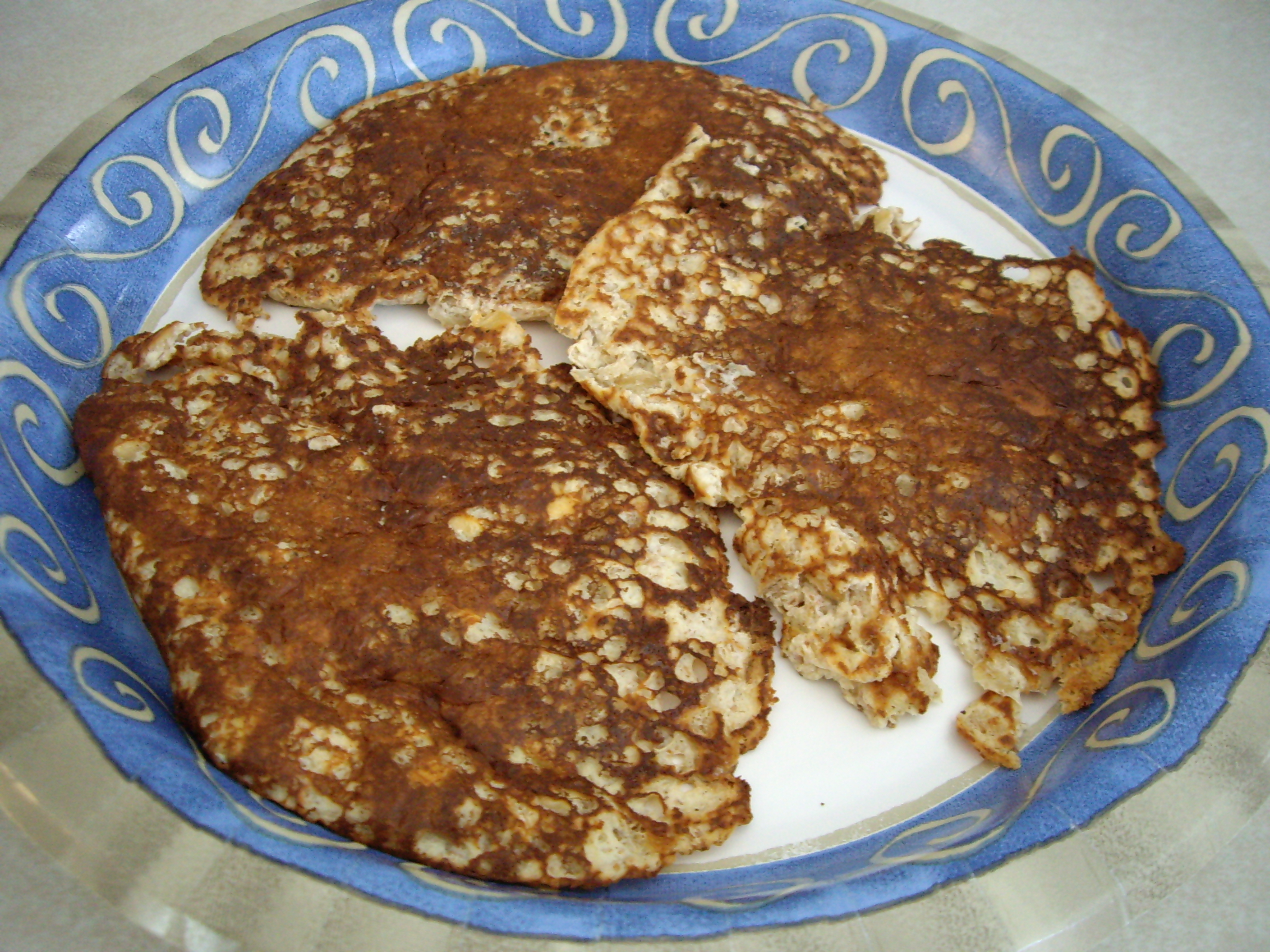 Yes you read correctly. Oatmeal. And yes, I did eat oatmeal! And yes I did like it! BUT, it was in pancakes. Not as a cereal. (that will NEVER happen) But I still ate it! The pancakes were so good too! Last weekend my husband wanted pancakes. We never have a mix on hand because we make it once and then it sits there for months and months and by the time he wants them again the mix is no longer any good. So I found a recipe in the South Beach Diet Cookbook and changed it up a bit. I used fat-free half-and-half in place of fat-free milk, soy flour in place of whole wheat flour and toasted wheat bran instead of toasted wheat germ. Came out awesome! The only problem was that I do not have a good flat griddle pan. I had to use my largest frying pan and needless to say the pancakes were a bit on the odd-looking side. They were not round. But they tasted really good! Nutty and a little more chewy than pancakes usually are but really tasty. I was going to add some cinnamon to the batter but I forgot. Next time! So please excuse the photos, don’t judge by their looks. We also used agave nectar instead of syrup and it was delicious. Didn’t have to use so much of it either! Oh and if you decide to make them you need prep time. About 40 minutes of “sitting” is needed. Read below and you’ll see what I mean.