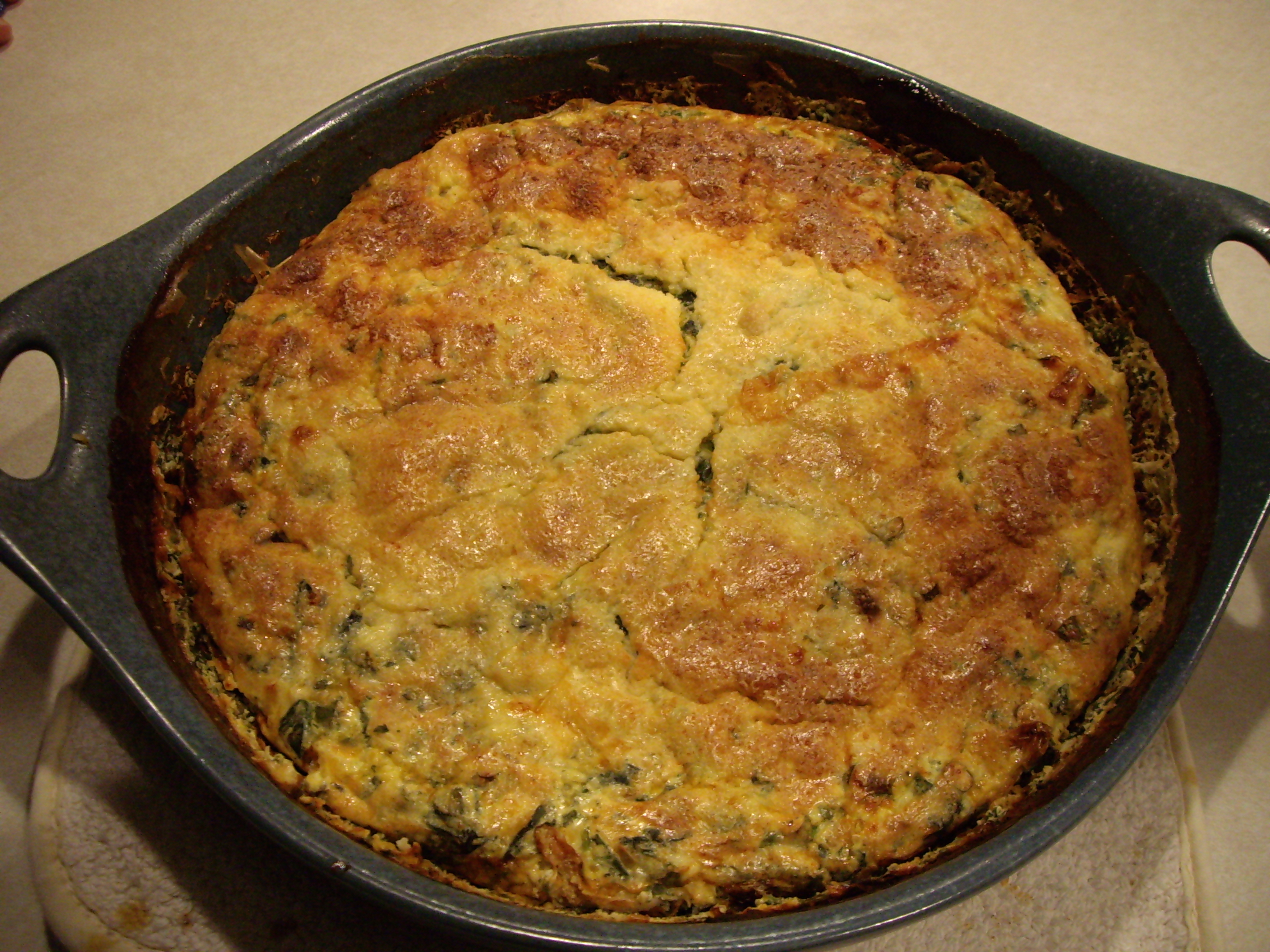 3. Bake at 350º for about 45 minutes. The top will puff up and then settle when you take it out of the oven. Let sit for about 5-10 minutes. Cut it up and serve!